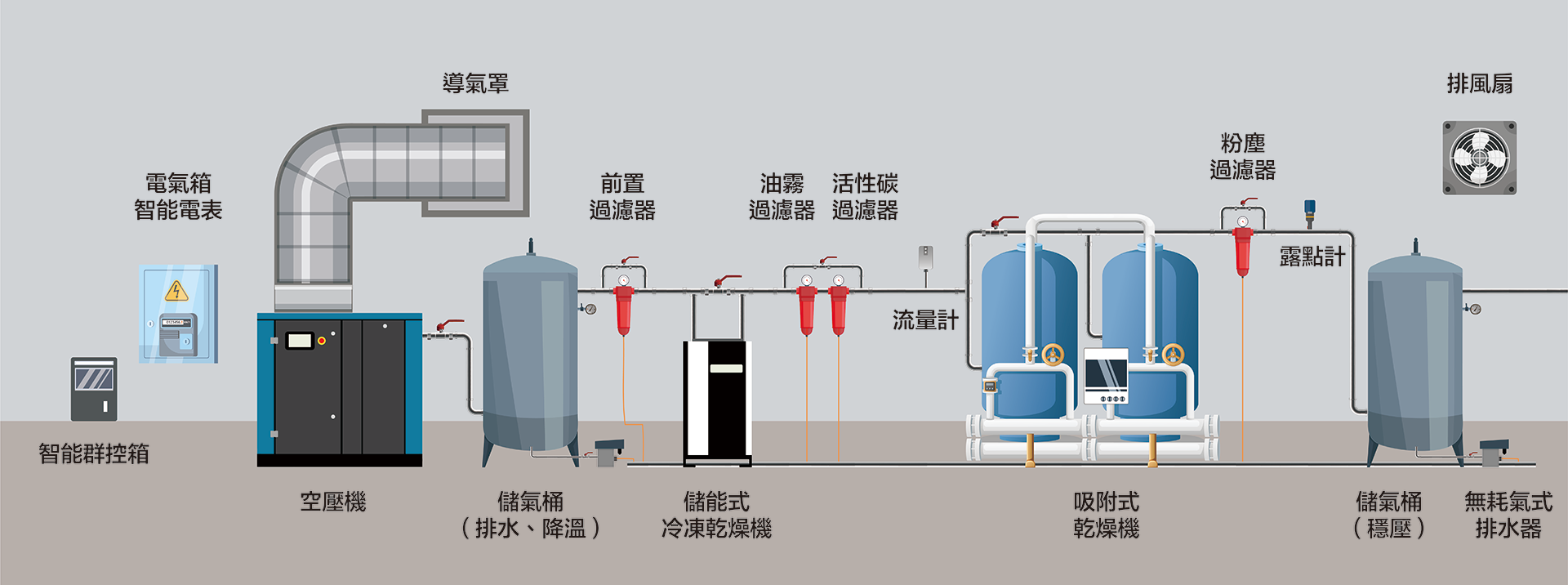 提供壓縮空氣處理解決方案(如冷凍式乾燥機、過濾器、排水閥等)。