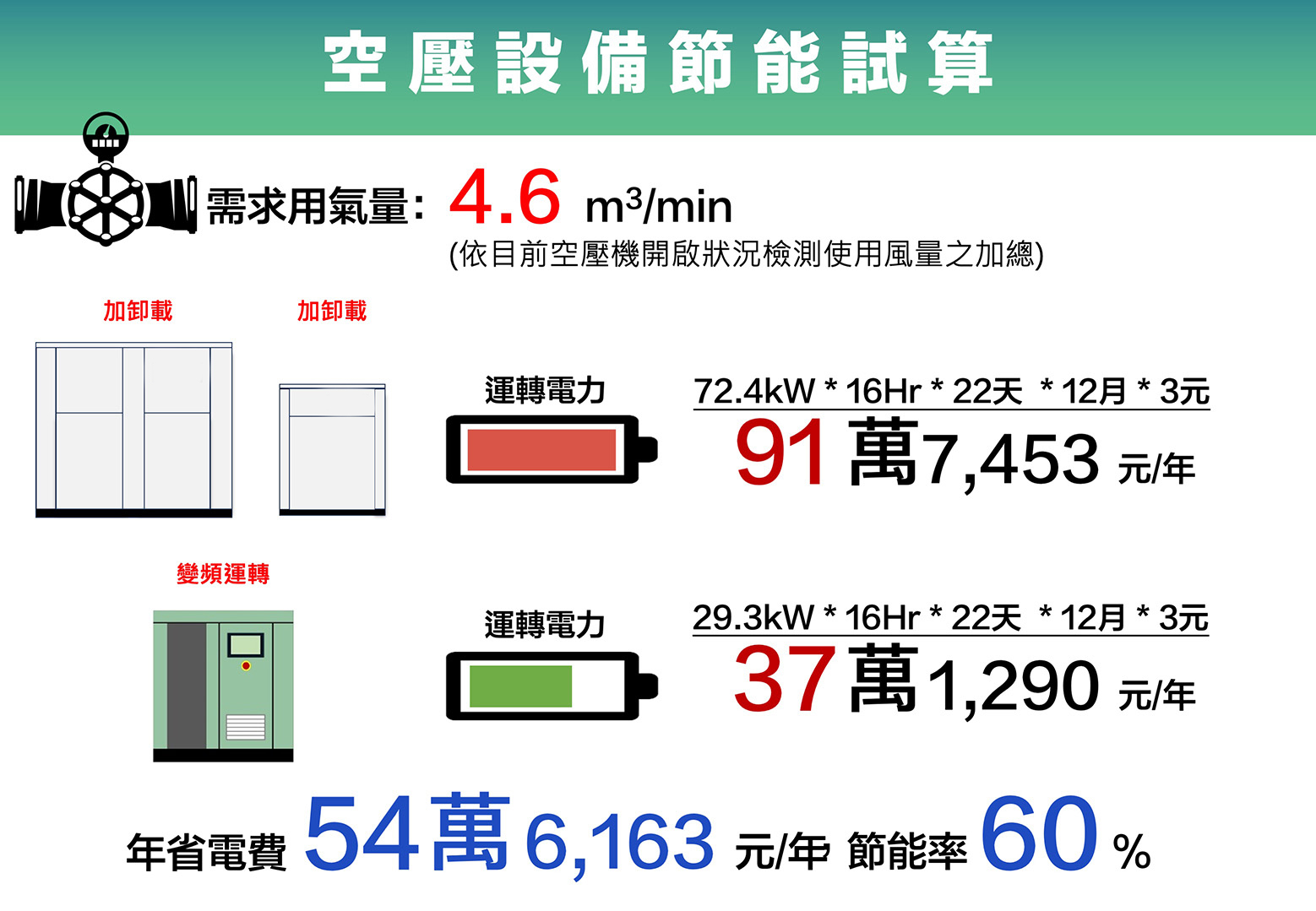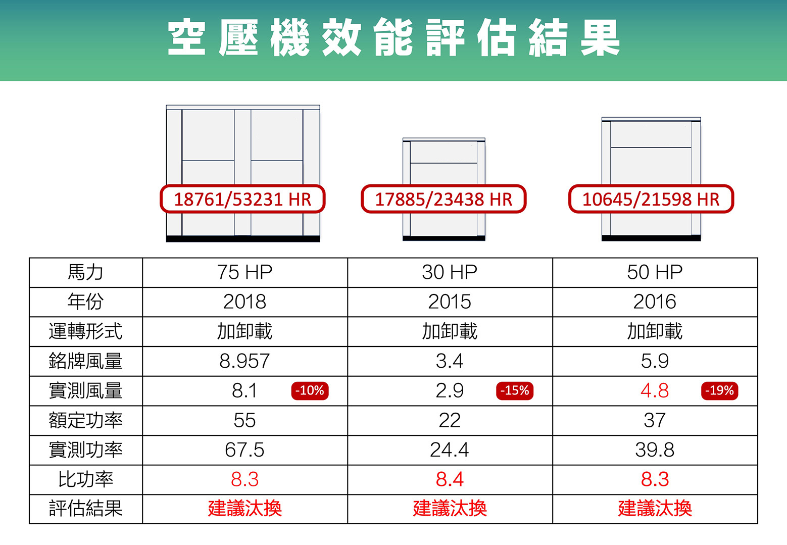 後經超賀空壓團隊做能效檢測評估後,用一台變頻 50HP空壓機變頻運轉即可