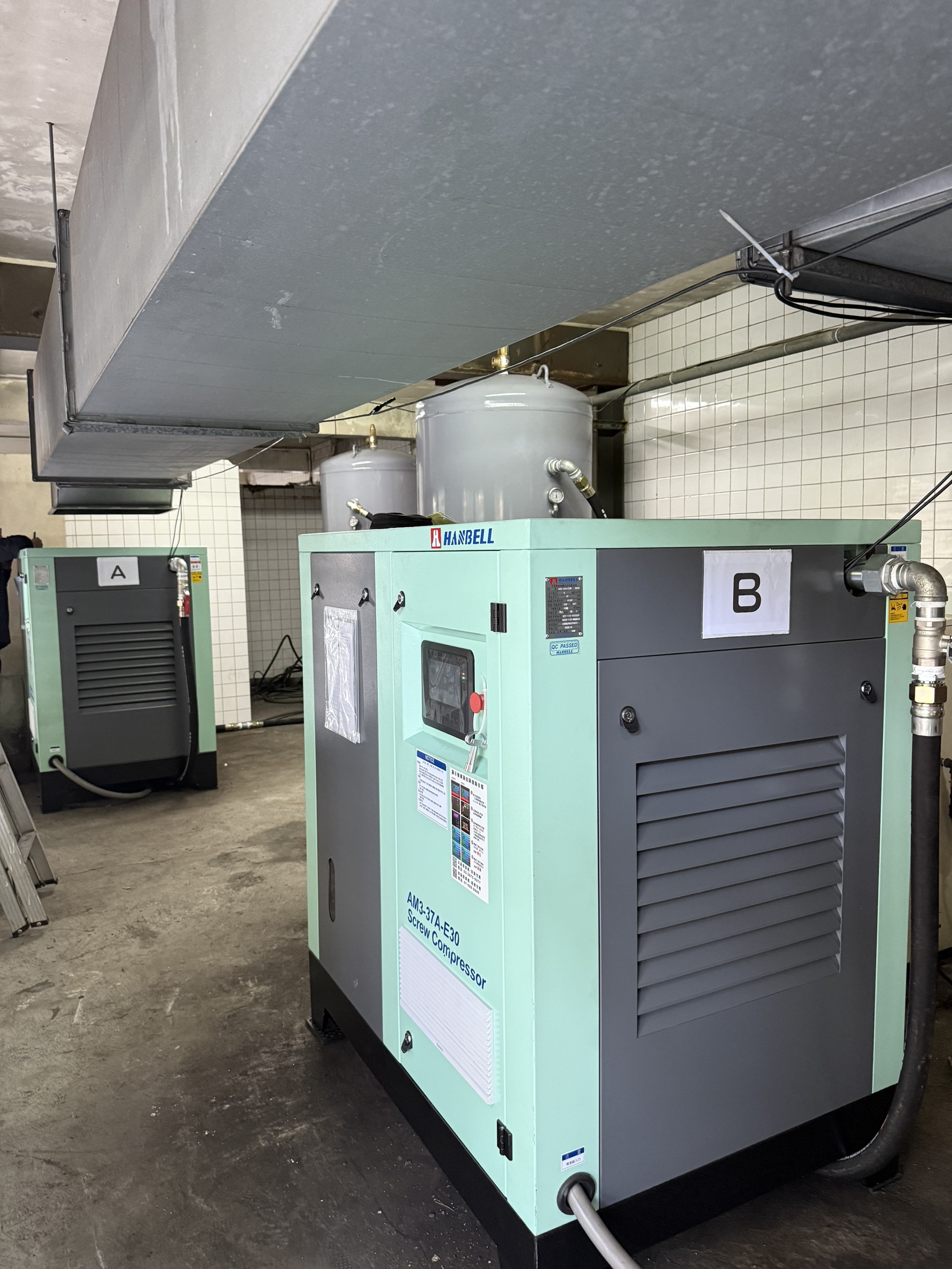 更換設備:以 兩台永磁變頻一級能效空壓機 取代原有定頻機種,有效提升運轉效率與穩定性。