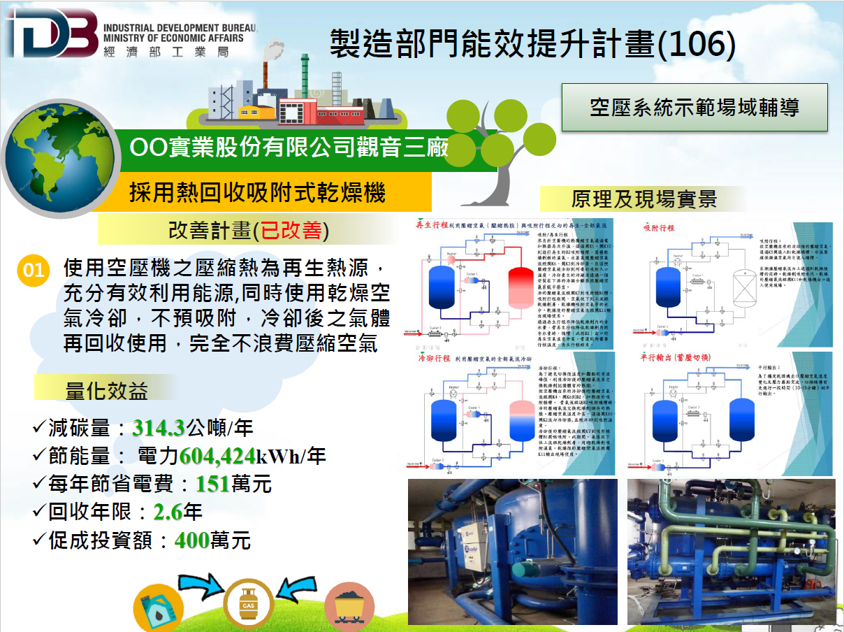 我司與經濟部工業局攜手合作,成功協助某觀音公司導入熱回收系統吸附式乾燥機,達成顯著的環保與節能效益。