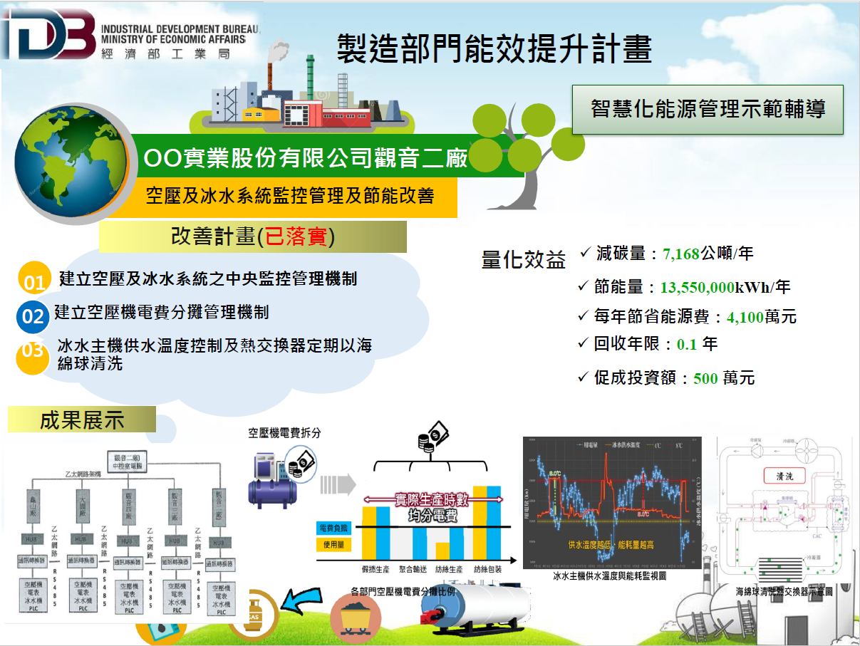 我司與經濟部工業局攜手合作,成功協助某觀音公司導入永磁變頻螺旋空壓機及冰水主機監控管理系統,實現了顯著的減碳與節能效益。