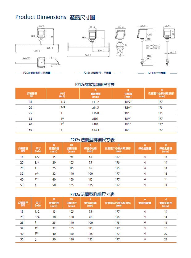 F212x管道式:提供DN15~DN80多種規格,支援螺紋及法蘭連接方式,最高支援6.3MPa工作壓力。