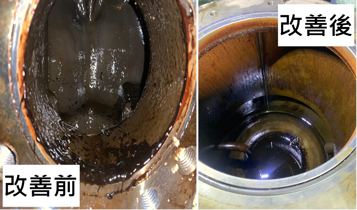 改善前,內部堆積大量油垢與雜質,導致機台運作困難;改善後,內部清潔如新,運作更加流暢。