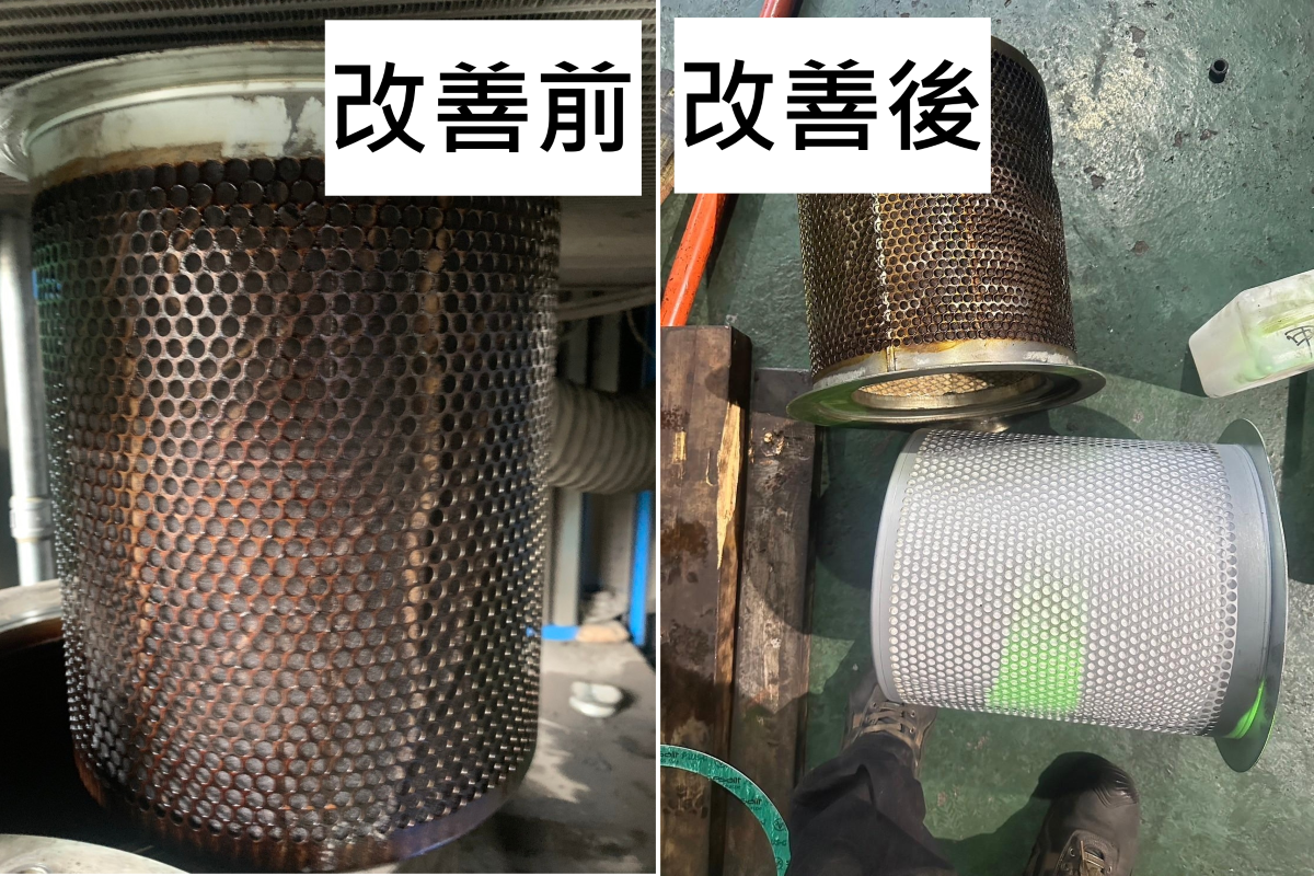 改善前,油氣分離器表面油污堵塞;改善後,使用全新原廠油氣分離器,提升油氣分離效能。