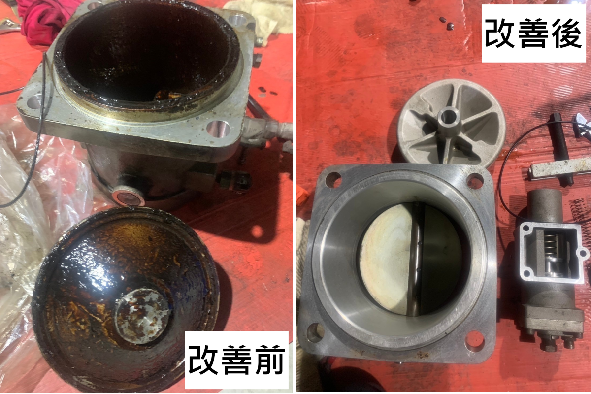 改善前,機件嚴重積碳與損耗;改善後,零件全面清潔翻修,恢復最佳性能。