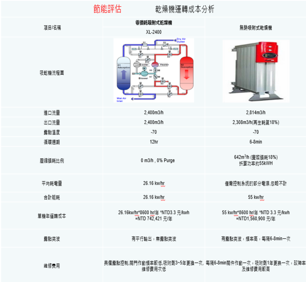 EverAir GmbH 的吸附式乾燥機不僅在技術上領先,更在節能減排方面展現出顯著優勢。以下為 XL-2400 與傳統乾燥機的運行成本比較: