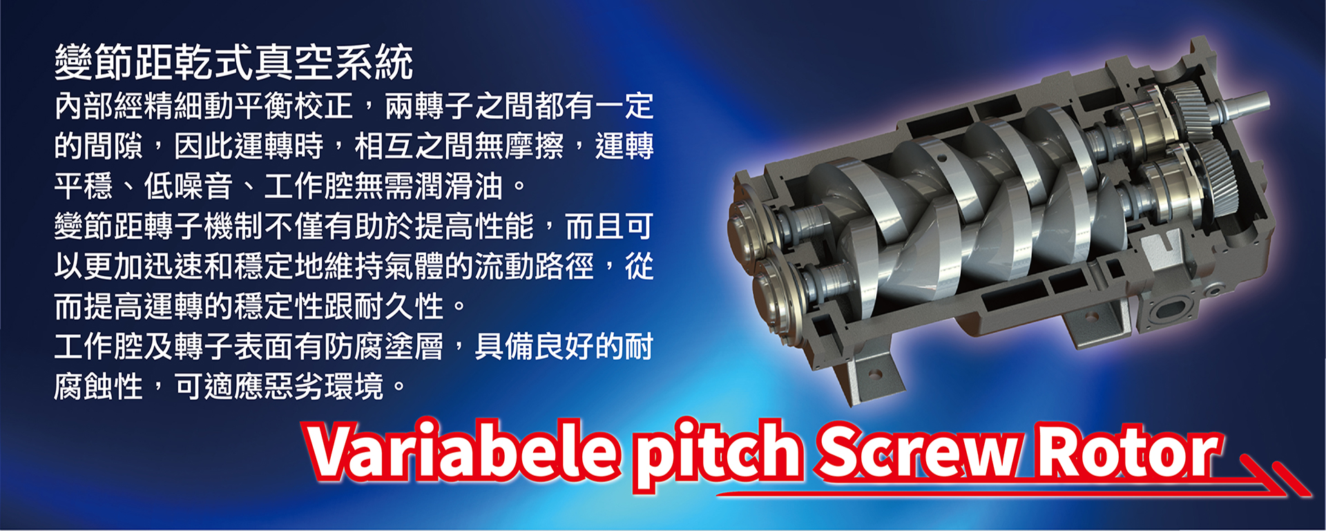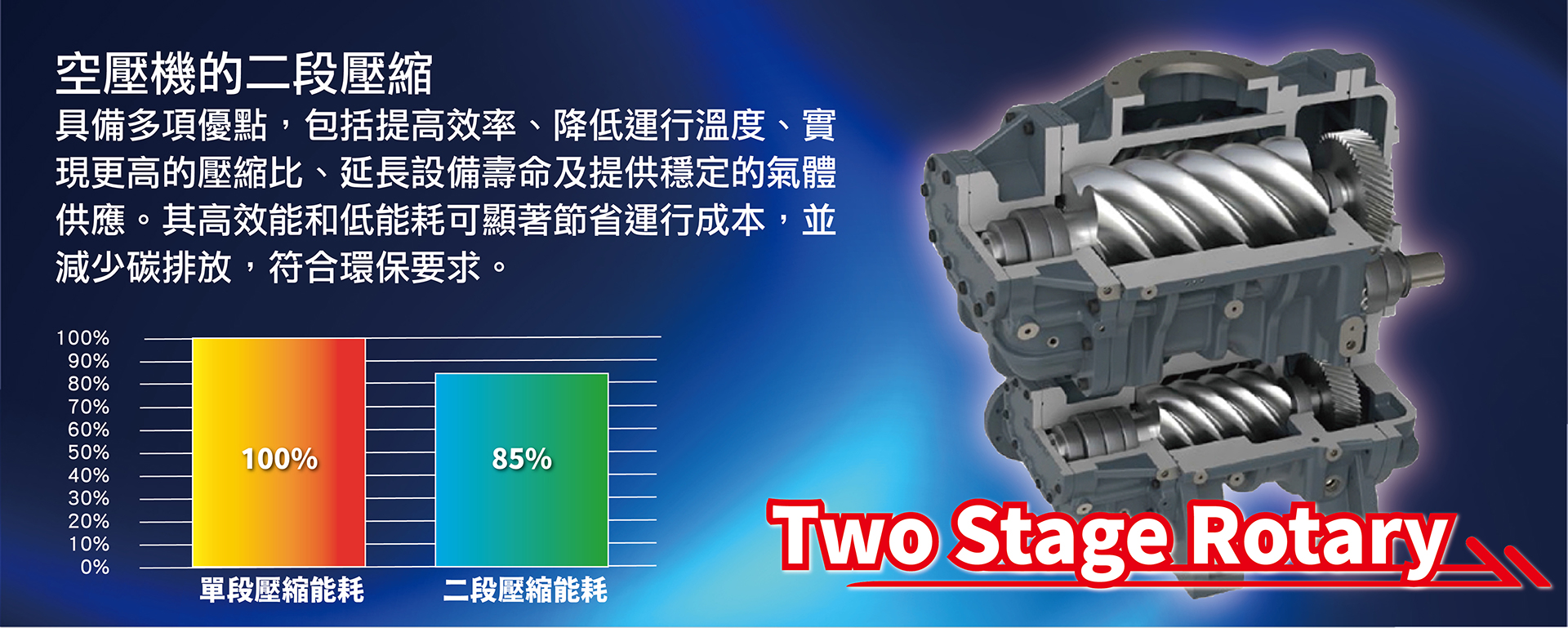 - 設計功率:55~400 kW - 排氣量範圍:37~421 m3/min - 壓力範圍:0.4~1.5 bar - 冷卻方式:氣冷、水冷 - 潤滑方式:無油