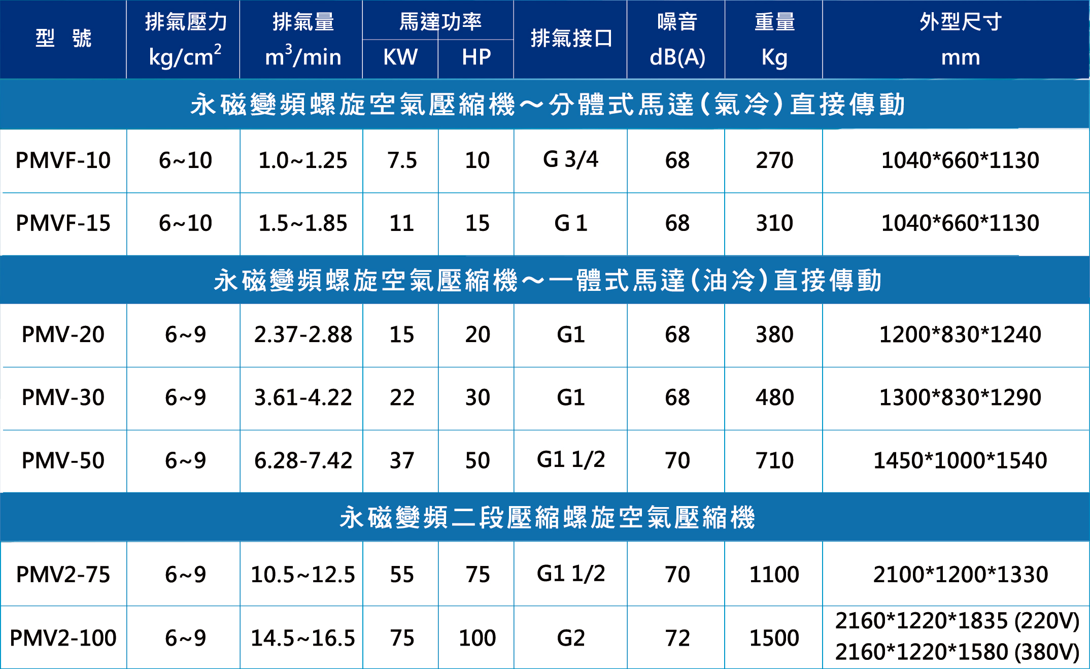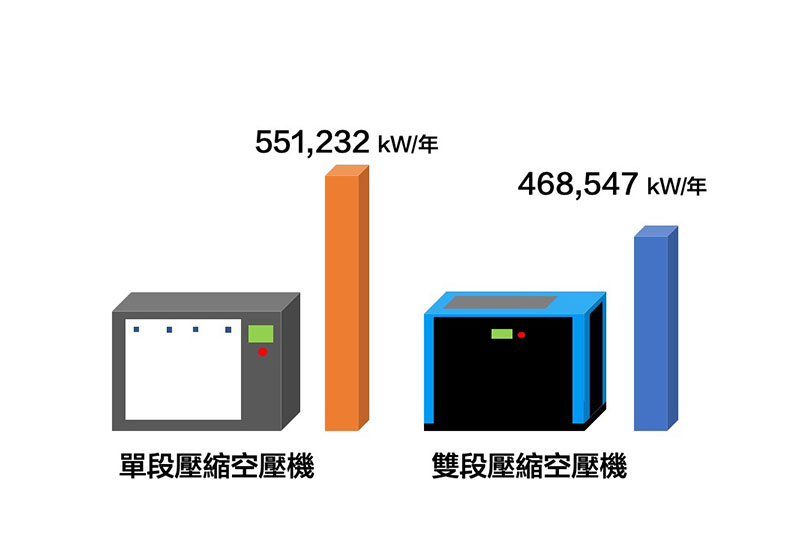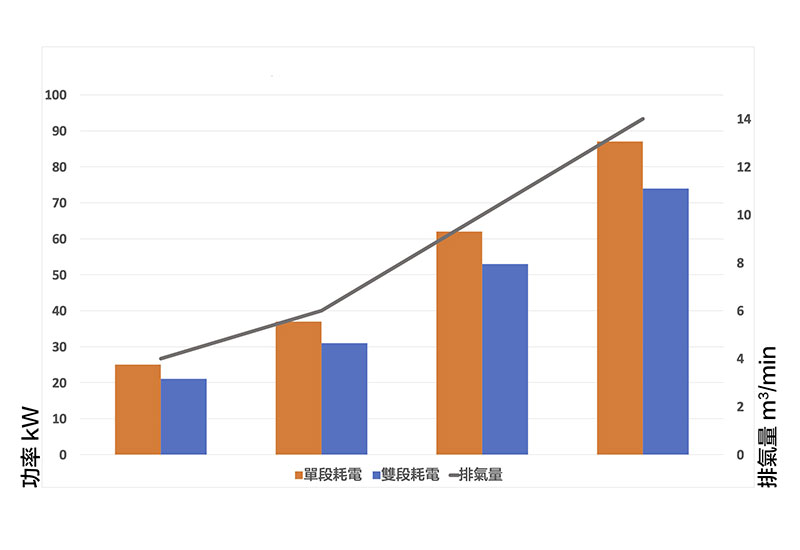 在相同排氣量下,雙段壓縮之排氣量會比單段壓縮大,故同樣馬力數的雙段壓縮空壓機負荷量會小於單段壓縮,耗電量也隨之降低了15~20%。